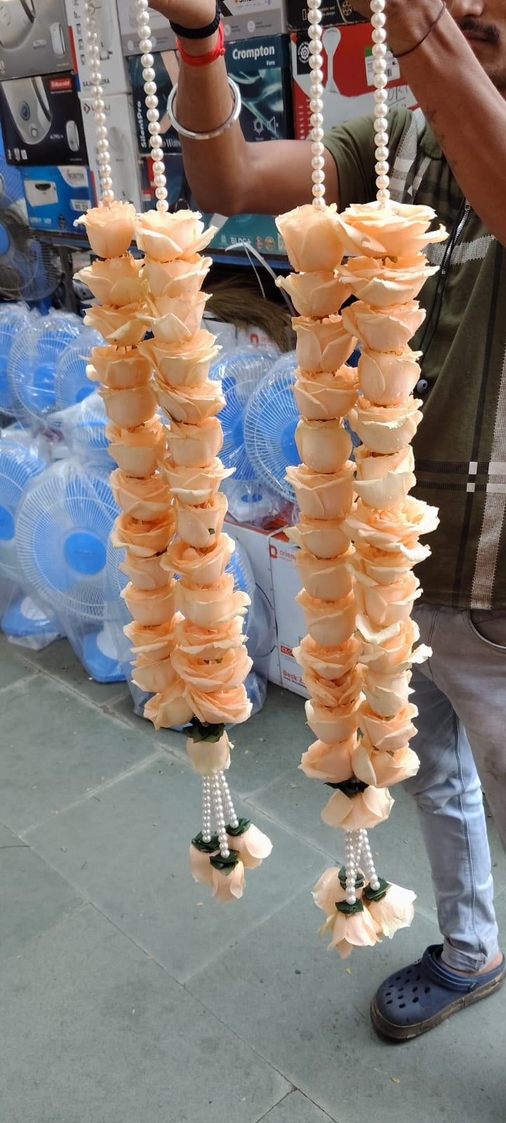 Add a touch of sophistication to your wedding rituals with our Wedding Garland (Peach rose with Latkan ). Crafted with vibrant, fresh red roses and enhanced with intricately designed latkans, this garland exudes grace and tradition. Perfect for bride and groom exchanges or ceremonial use, its luxurious design is both timeless and elegant. The soft petals of the roses combined with the decorative accents create a stunning visual impact. Handcrafted with care, this garland ensures beauty and freshness throughout your special day.